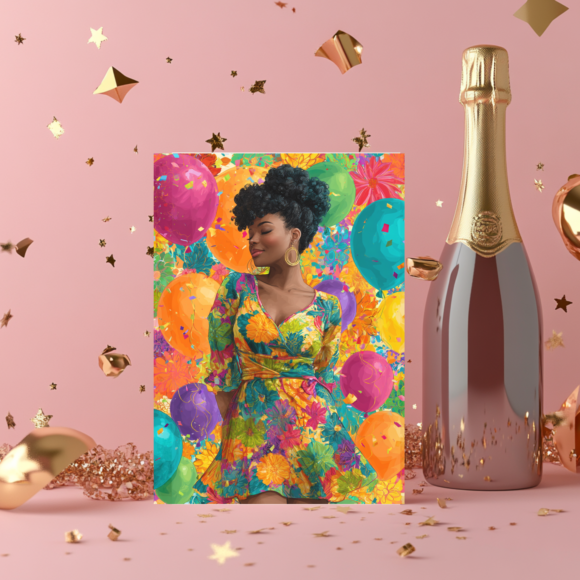 Make their special day with this card! 🎉 Vibrant Birthday Card beautiful color with this stunning greeting card! Featuring an illustration of a radiant Black woman with natural afro puffs, surrounded by a joyful burst of balloons, flowers, and confetti, this card is perfect for sending love, light, and celebration vibes.