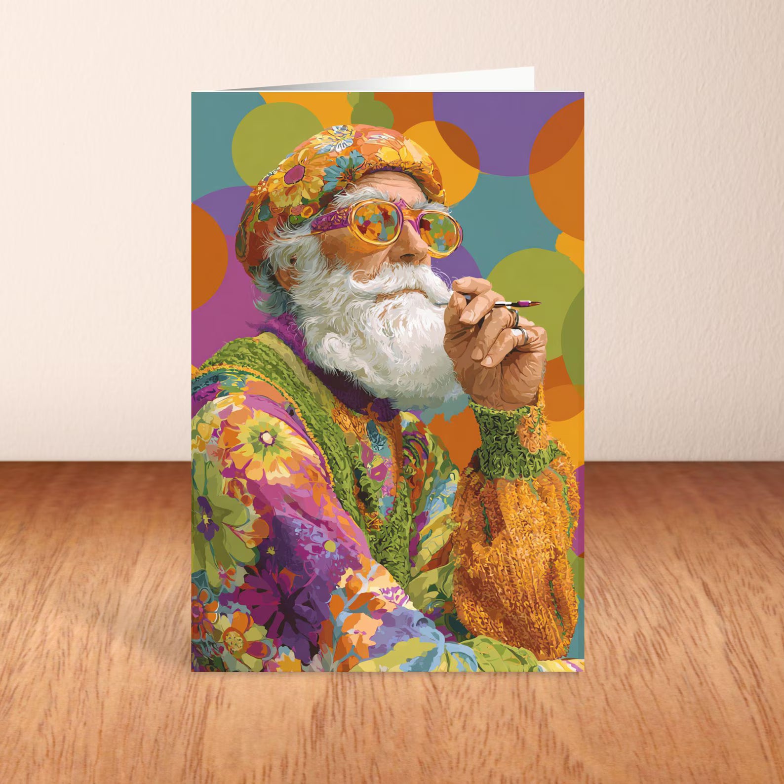 Send your holiday vibes with a splash of color and a whole lot of attitude! This Groovy Santa Greeting Card features a retro-inspired, psychedelic Santa Claus decked out in colorful floral fashion with funky glasses and major 70s flair.